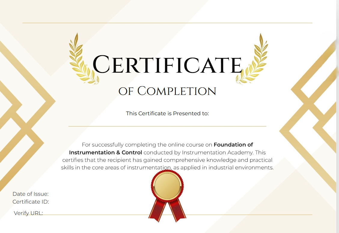 This certificate serves as an official recognition of your participation and engagement with the course content delivered by Instrumentation Academy. It is a valuable addition to your professional portfolio, showcasing your commitment to continuous learning and career development in the field of instrumentation.